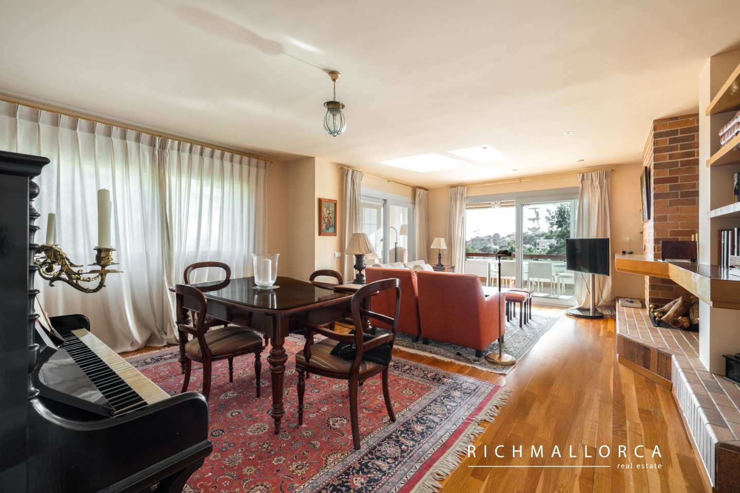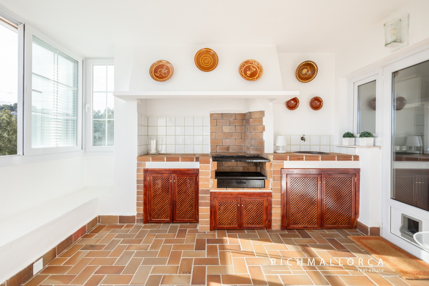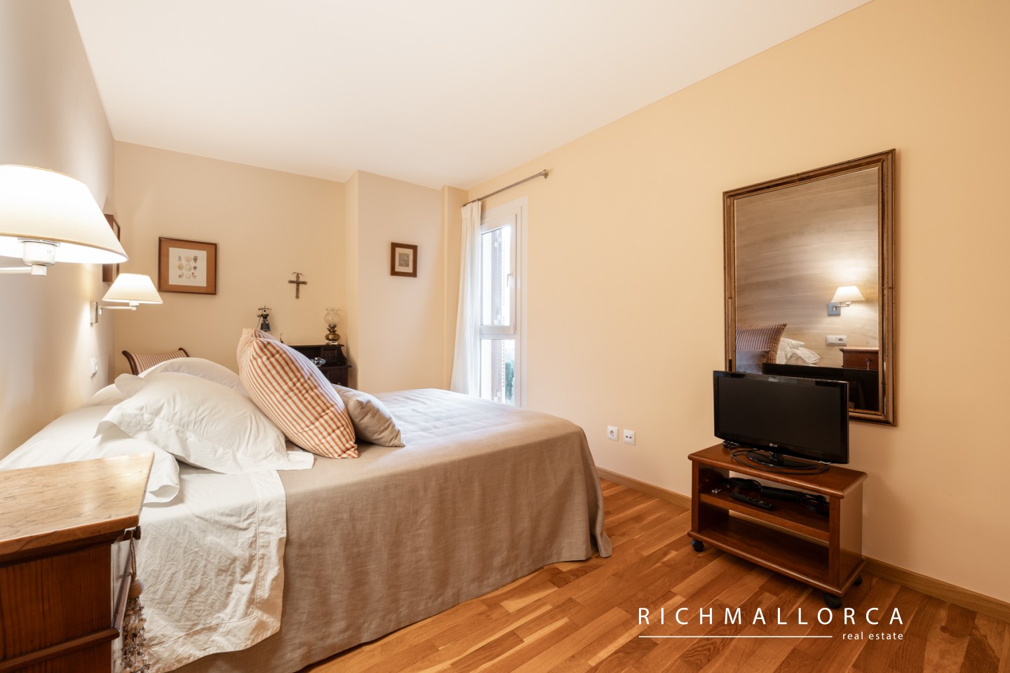 High-quality features include real wood flooring, PVC double-glazed windows with traditional Mallorcan shutters, a modern fitted kitchen with all appliances, gas water heating, a security entrance door, and an alarm system.