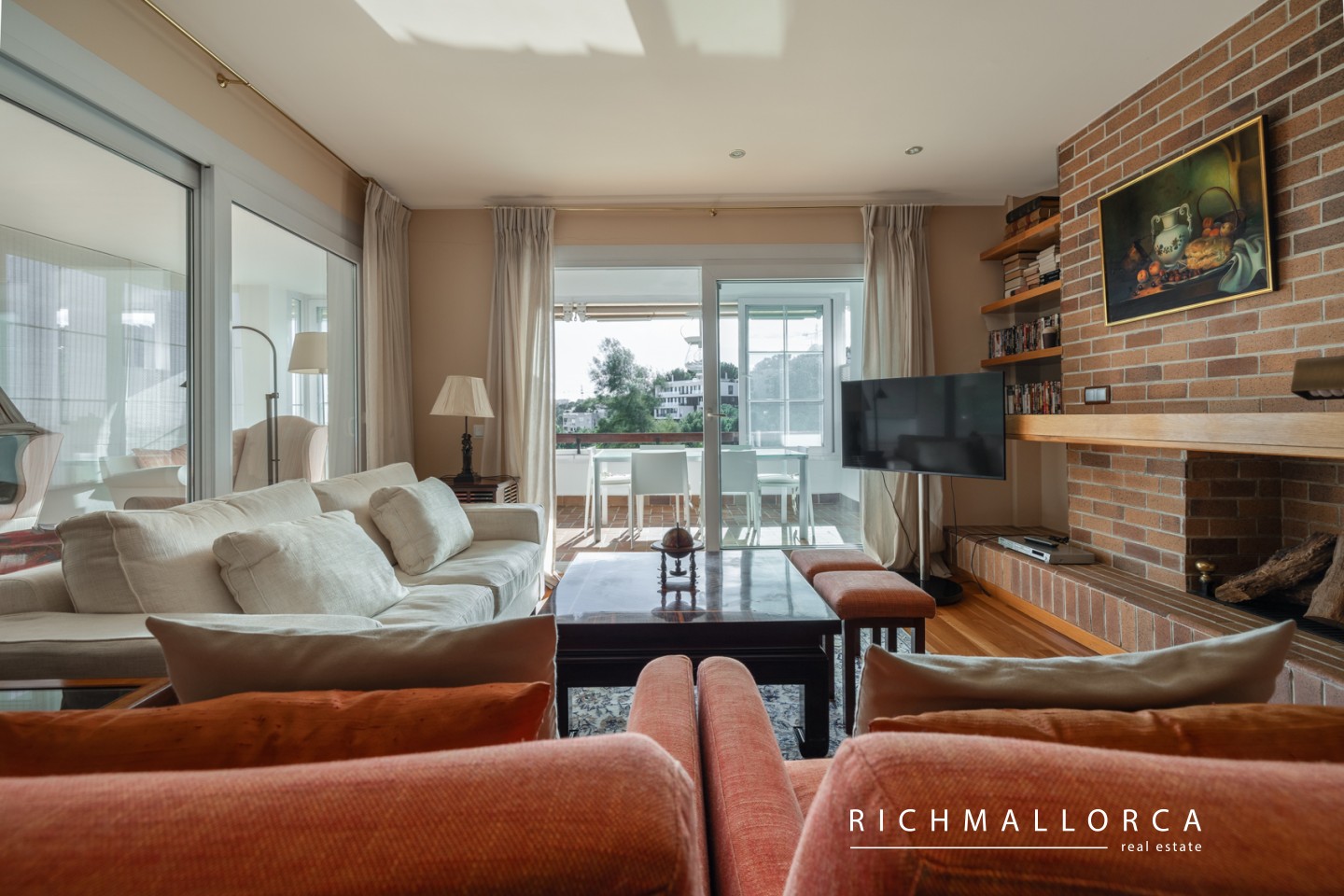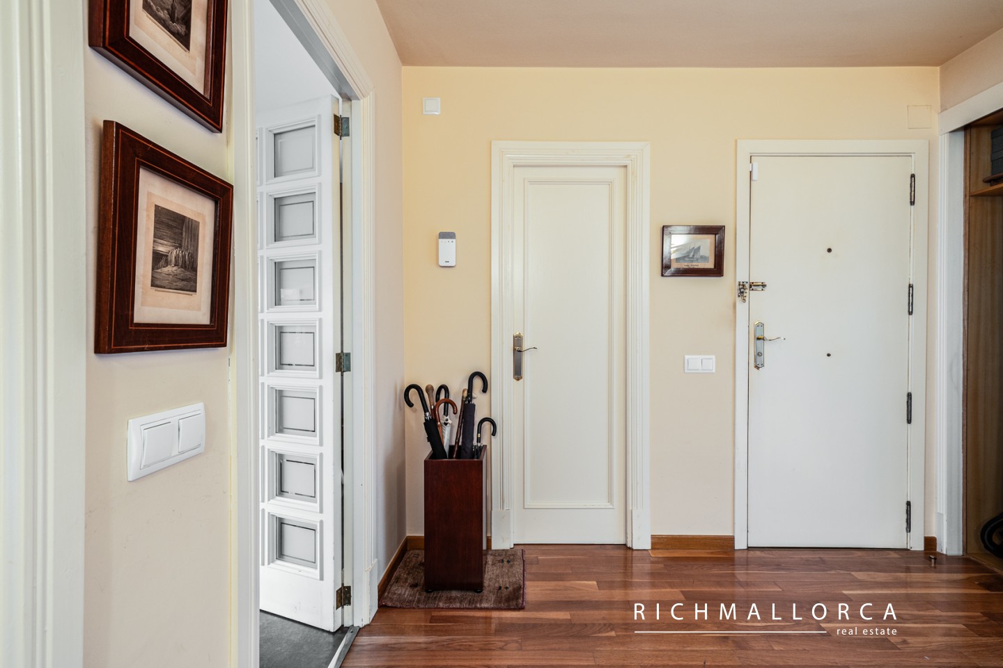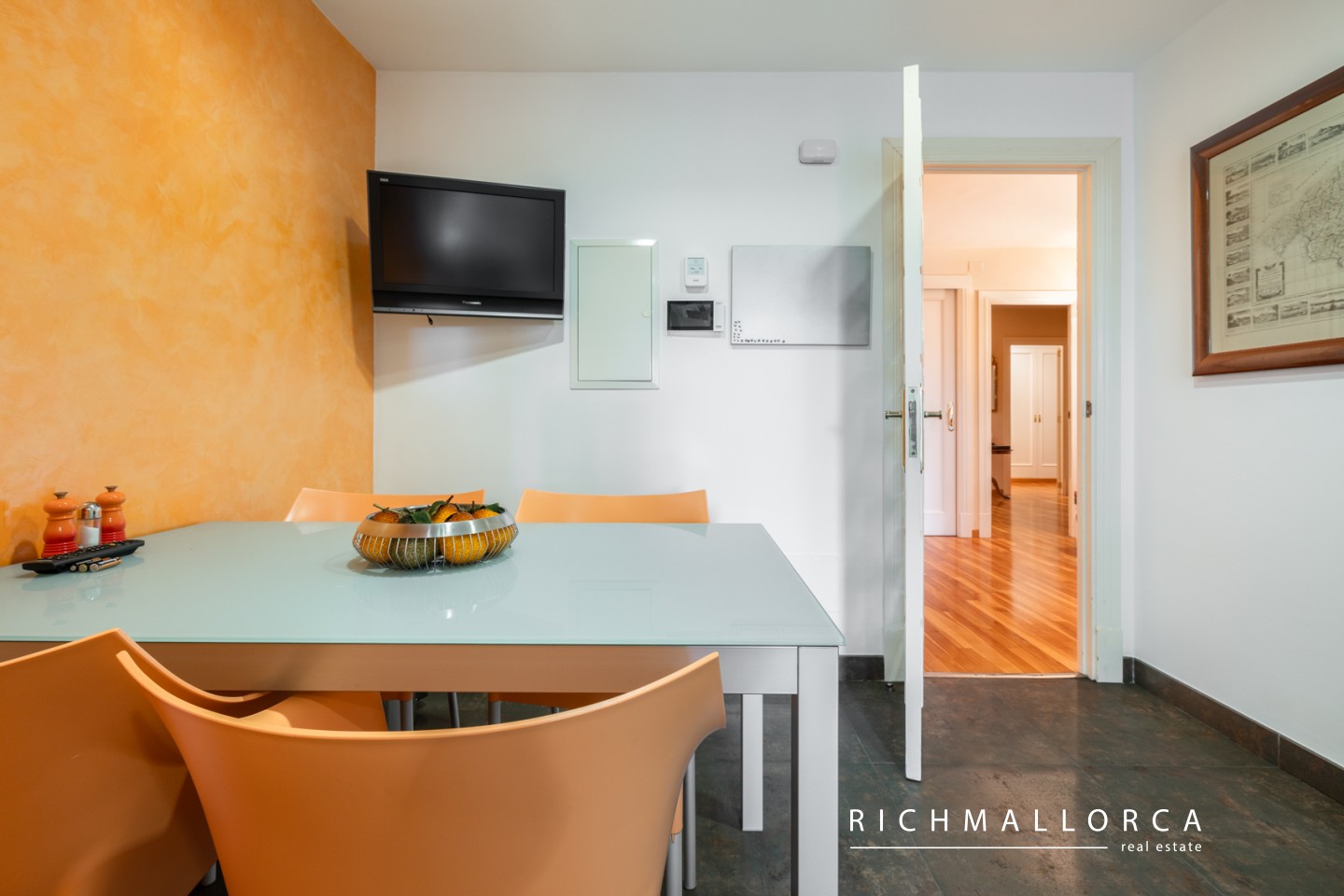 High-quality features include real wood flooring, PVC double-glazed windows with traditional Mallorcan shutters, a modern fitted kitchen with all appliances, gas water heating, a security entrance door, and an alarm system.