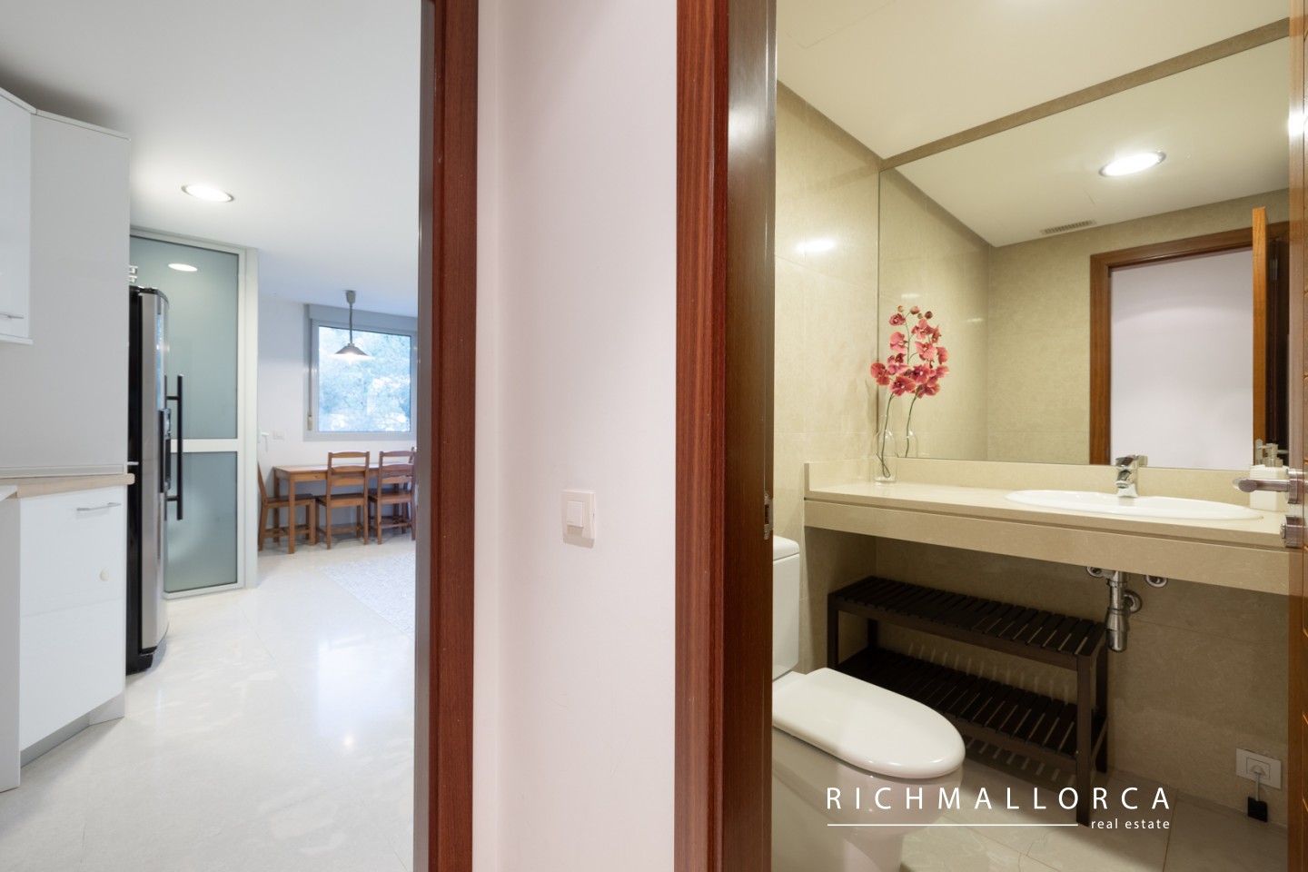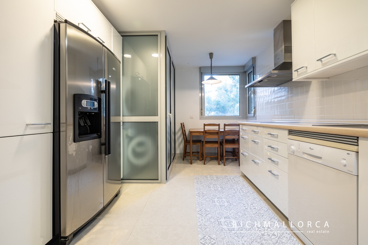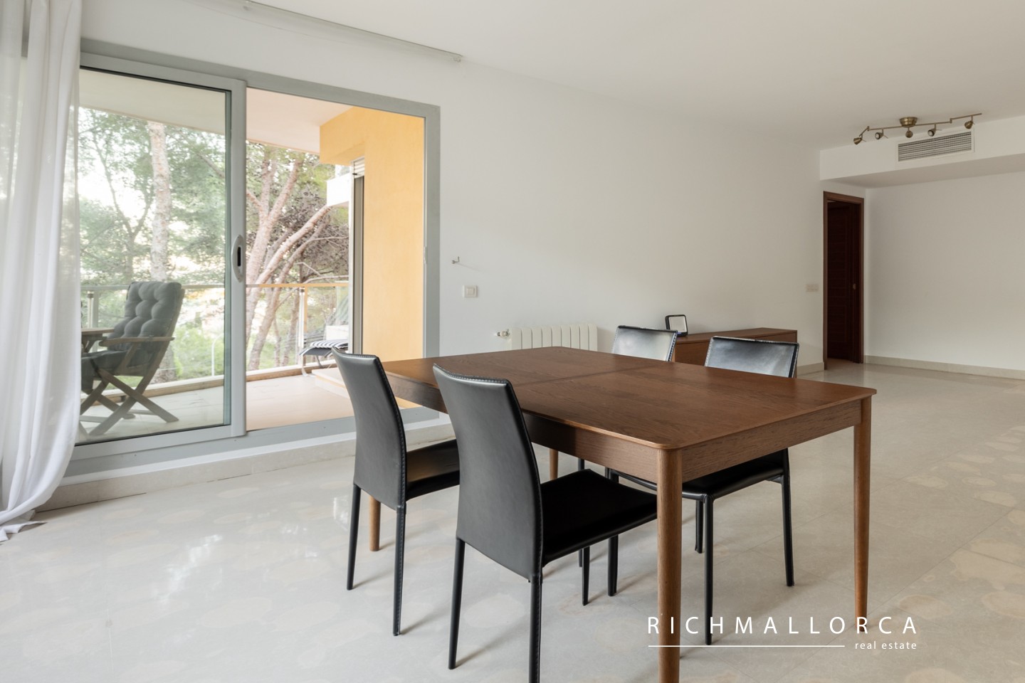 With a built area of 119 m² plus 29.88 m² of terraces, the property offers a bright living-dining room with access to a spacious covered terrace, a separate fully equipped kitchen with adjoining laundry room, two double bedrooms (one en-suite), each with its own terrace, two bathrooms, and a guest toilet.