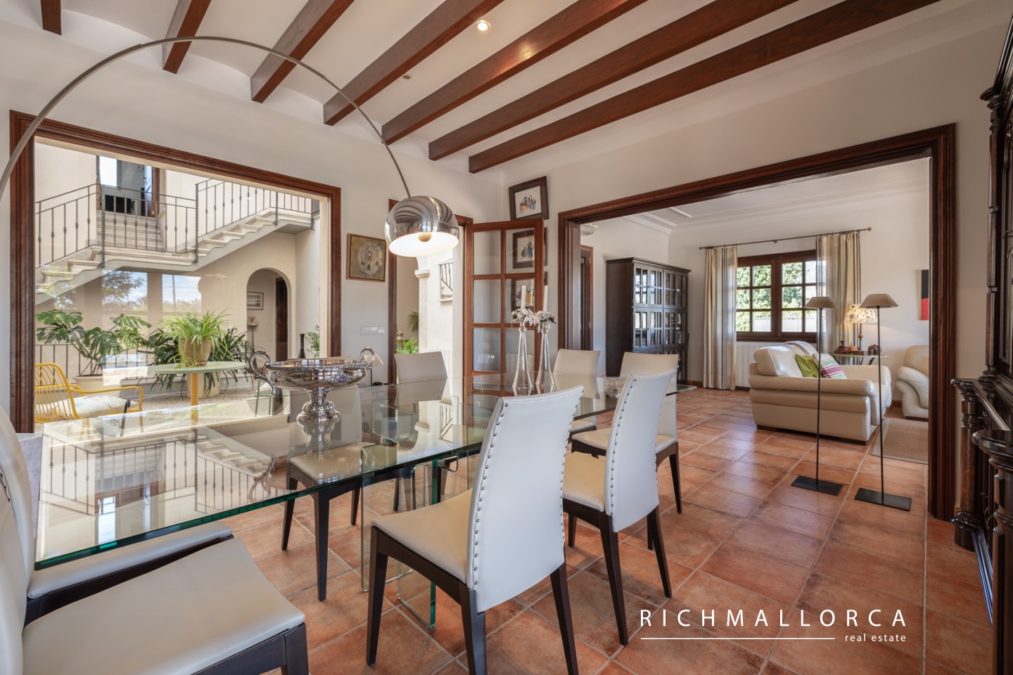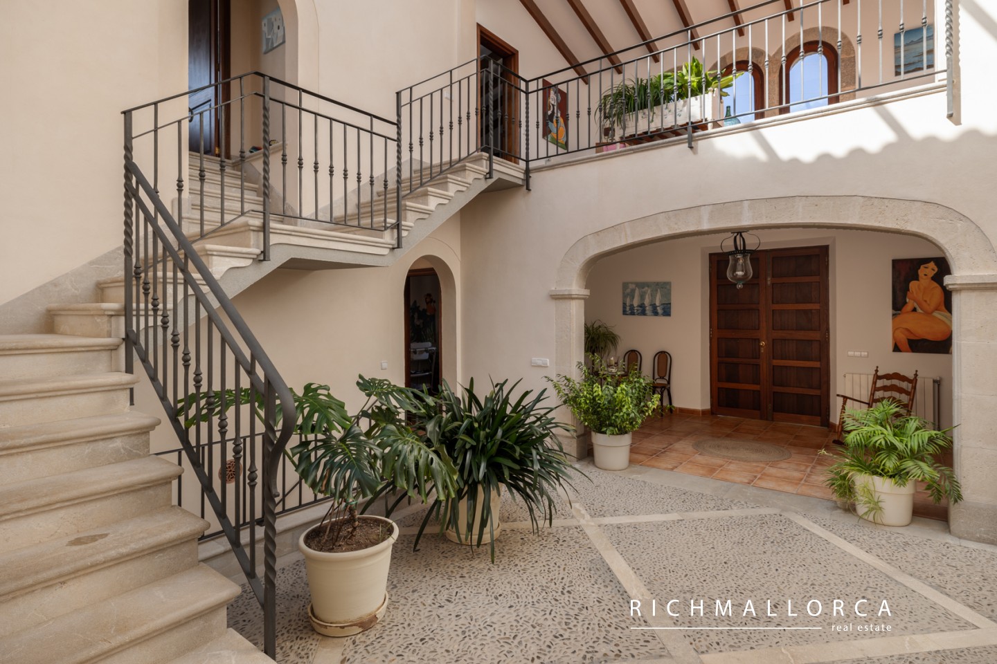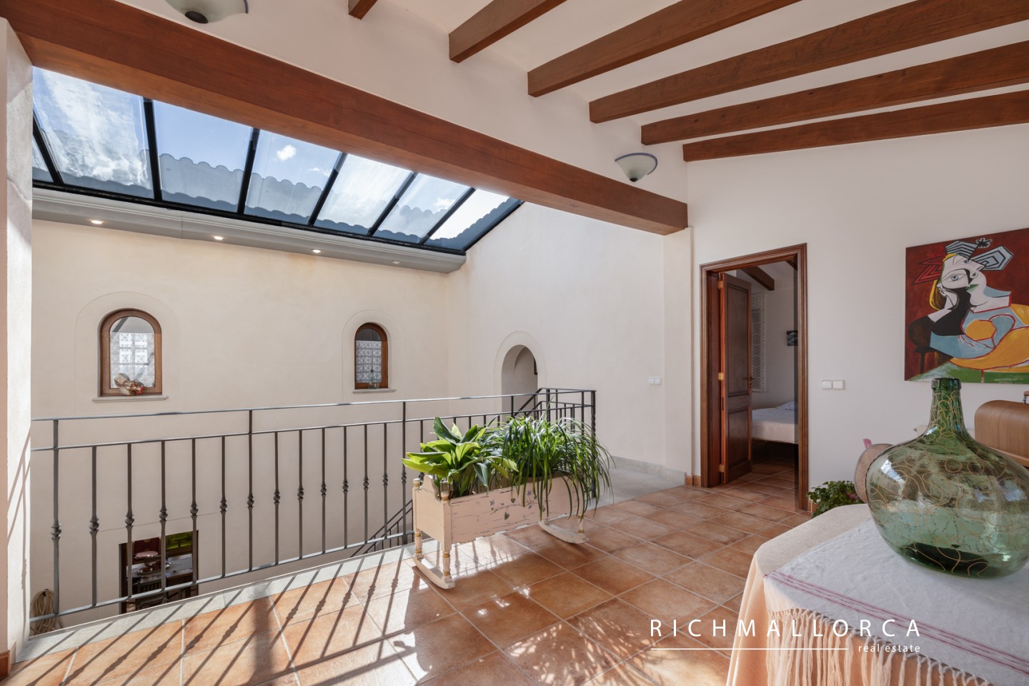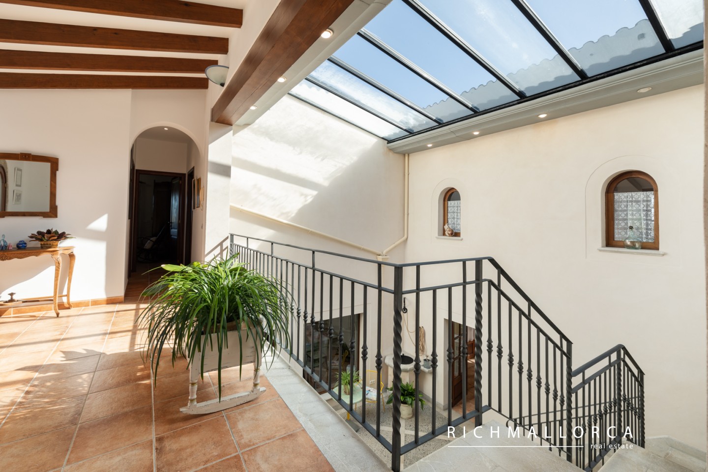 A spacious and beautifully crafted residence offering 572 m² of constructed space across two main living floors plus a basement, set on a private 5.600 m² rustic plot between Lloseta and Inca. The property features a large garage for two cars, a bright living and dining area with fireplace, a fully equipped kitchen with pantry, a laundry room, one bedroom and a bathroom on the main level, along with several outdoor terraces for year-round enjoyment. On the south side of the house, an inviting terrace hosts a summer kitchen with gas barbecue. The jewel of the home is a traditional Mallorcan central patio with natural light and a water cistern, forming the heart of the property and connecting the different living spaces.