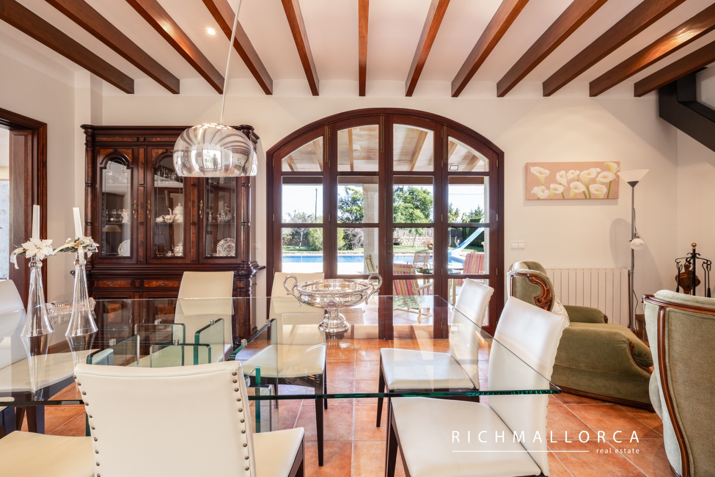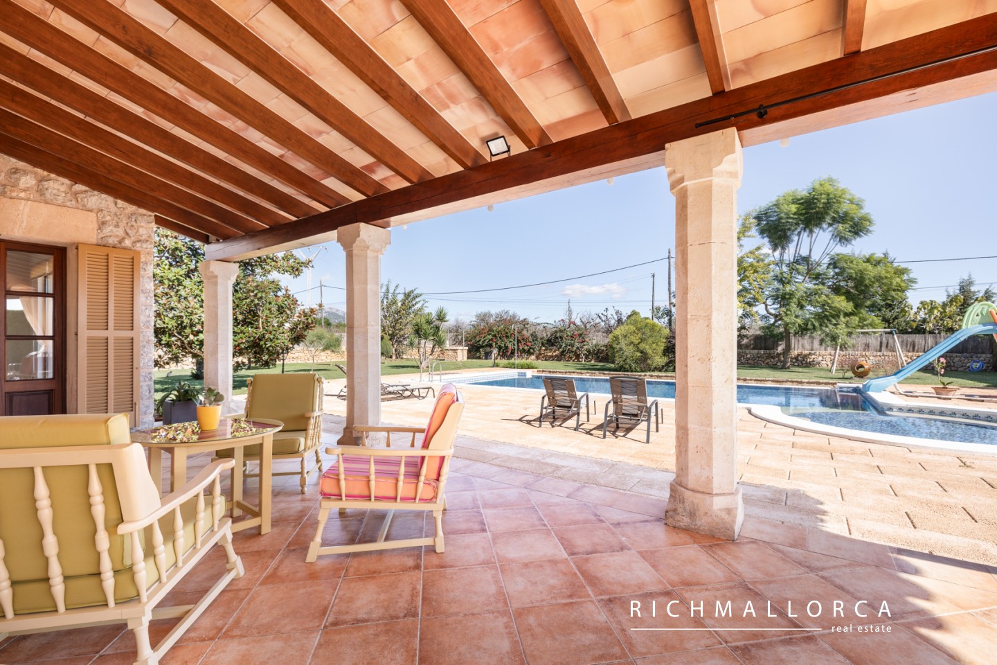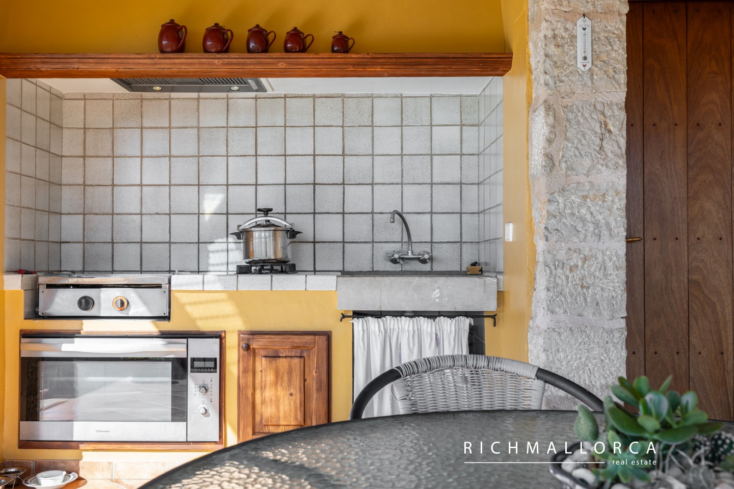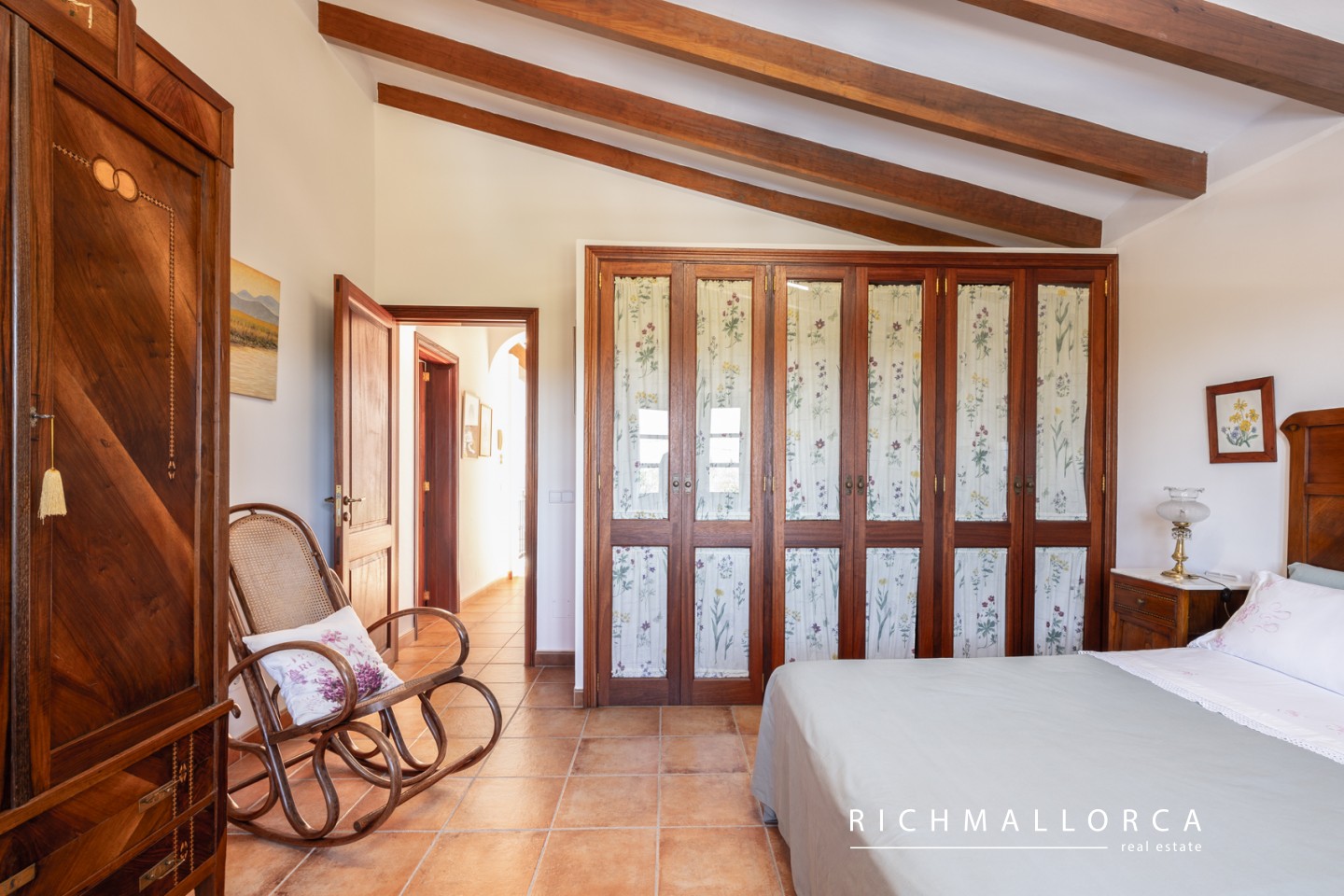 A spacious and beautifully crafted residence offering 572 m² of constructed space across two main living floors plus a basement, set on a private 5.600 m² rustic plot between Lloseta and Inca. The property features a large garage for two cars, a bright living and dining area with fireplace, a fully equipped kitchen with pantry, a laundry room, one bedroom and a bathroom on the main level, along with several outdoor terraces for year-round enjoyment. On the south side of the house, an inviting terrace hosts a summer kitchen with gas barbecue. The jewel of the home is a traditional Mallorcan central patio with natural light and a water cistern, forming the heart of the property and connecting the different living spaces.