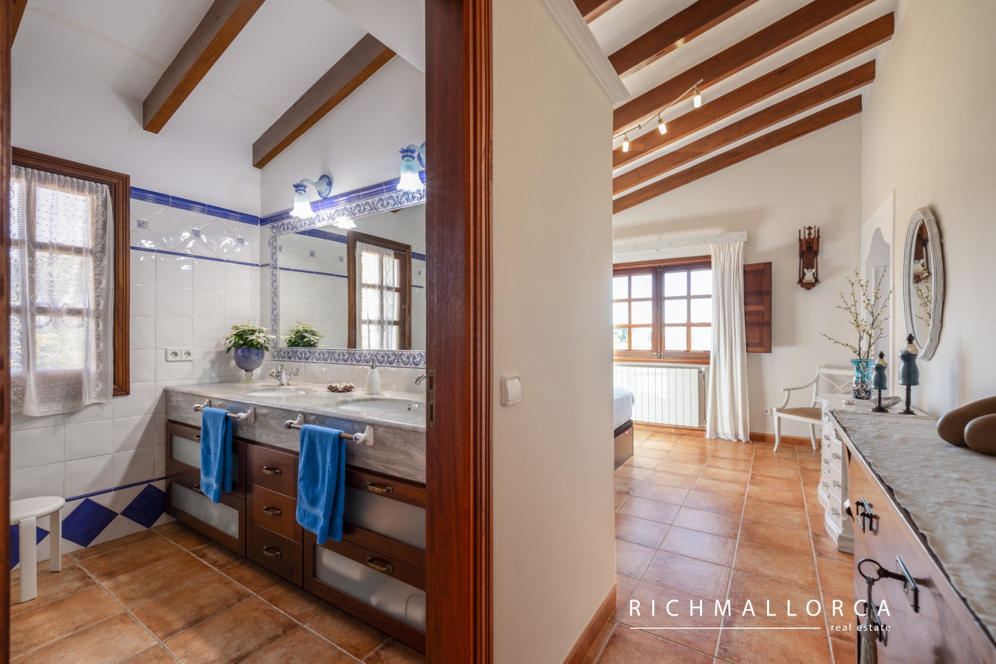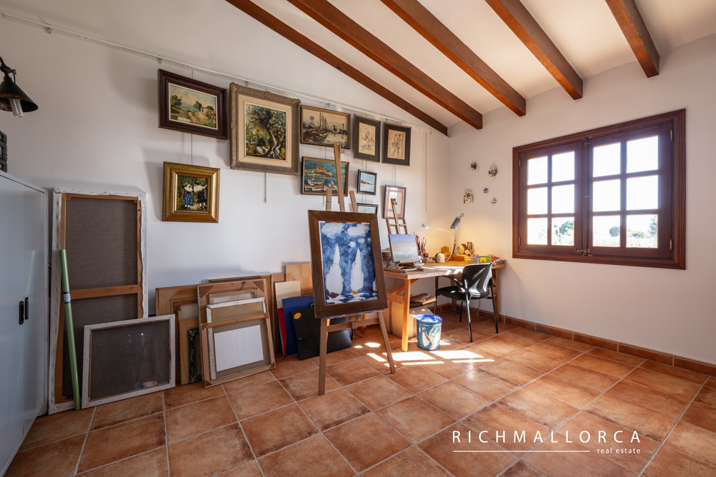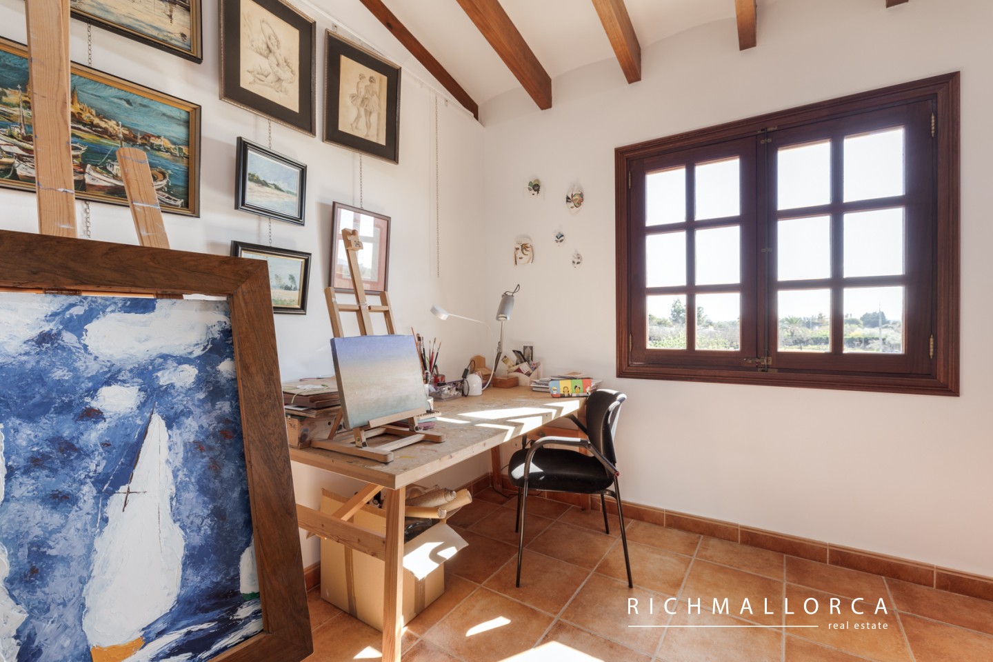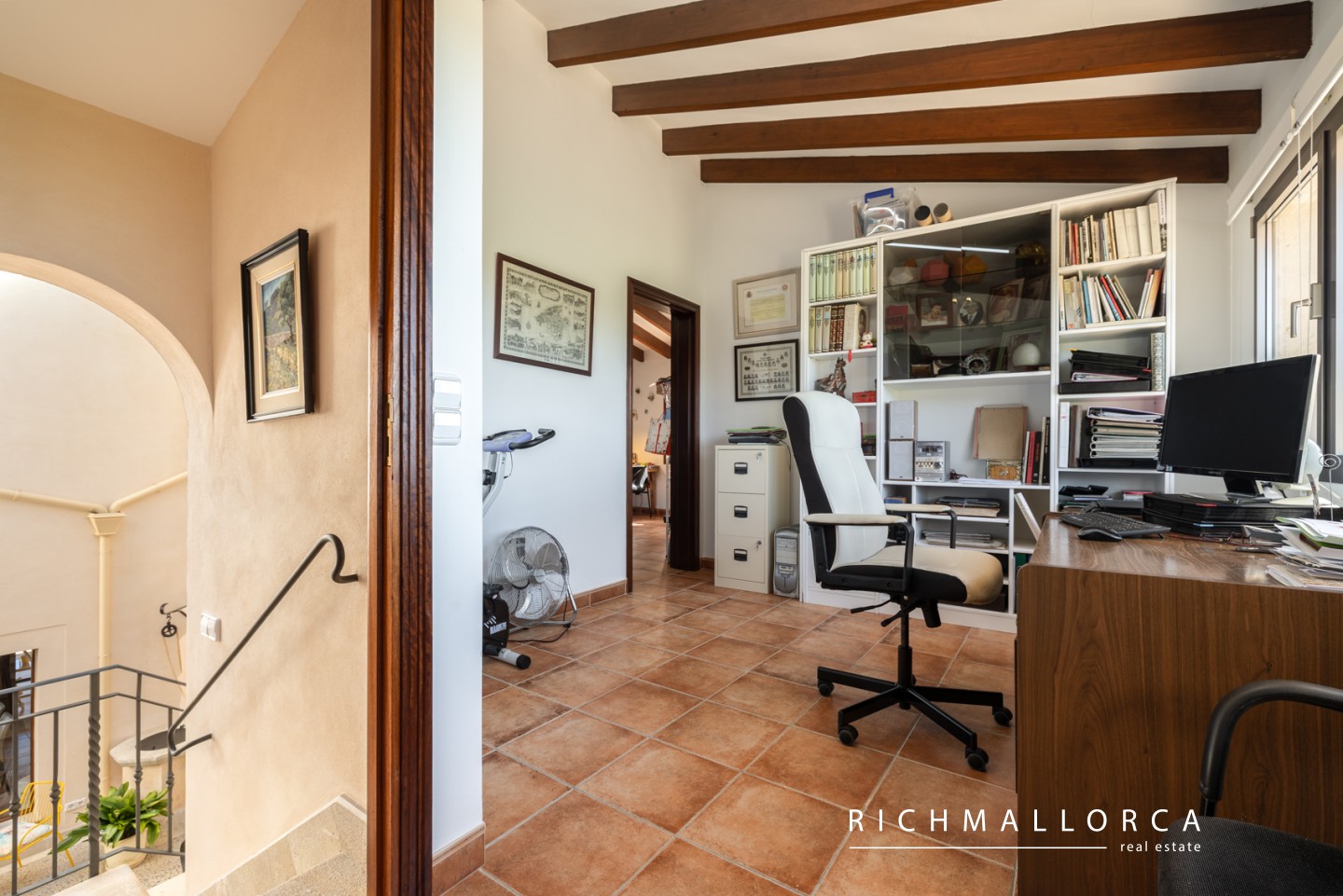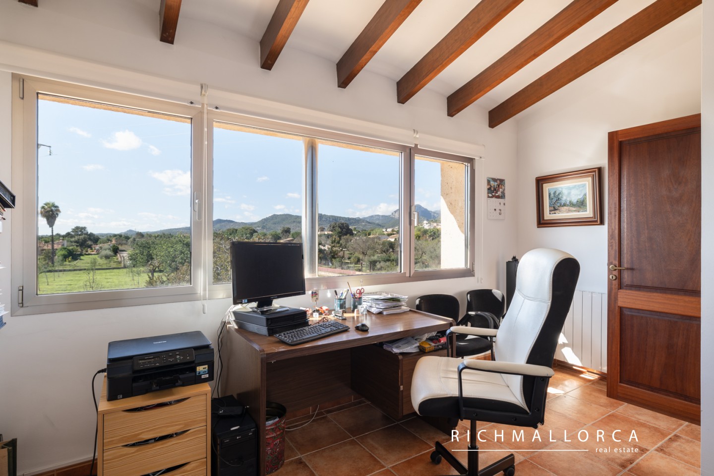 The upper floor offers three generous bedrooms, two bathrooms including a master suite with dressing room, and an additional room currently used as a study/office. Panoramic views of the Serra de Tramuntana and the village lend a charming atmosphere throughout.