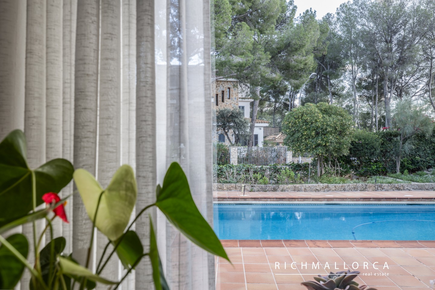 La casa está rodeada de un cuidado jardín y ofrece vistas panorámicas a las colinas verdes, la zona de Genova y parcialmente a la bahía de Palma.